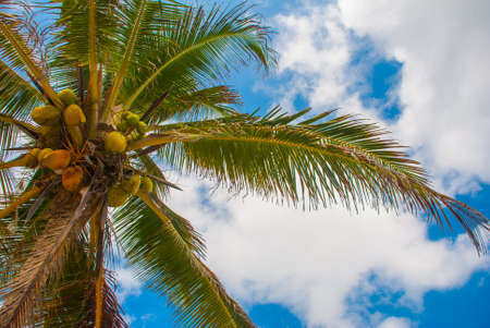 Tropical natural mexican palm tree with coconuts and blue sky background in Playa del Carmen Quintana Roo Mexico.