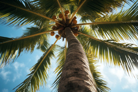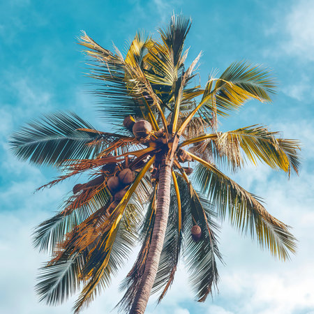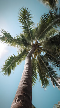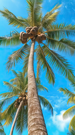 Discover the beauty of tropical palm trees reaching towards a bright sky. Coconuts dangle invitingly, capturing the essence of summer and relaxation.