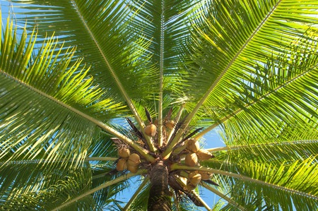 Bottom view of green palm trees with coconut. The foliage of the entire width