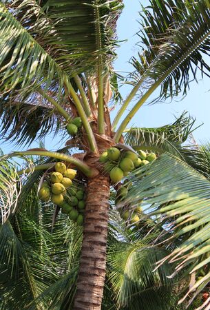 Coconut palm with a thick bunch of coconuts hanging near the crown, vibrant natural setting