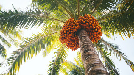 Mature palm oil trees with vibrant green leaves and fruit bunches, photographed against a clear sky, symbolizing tropical agriculture and natural resources