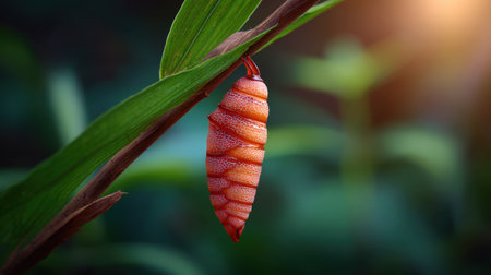A captivating image of a green chrysalis suspended from a branch, surrounded by lush foliage, showcasing the beauty of nature and the wonder of transformation.