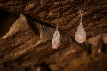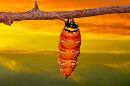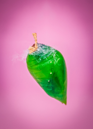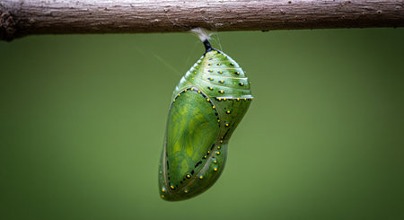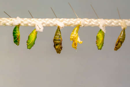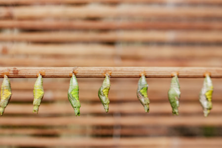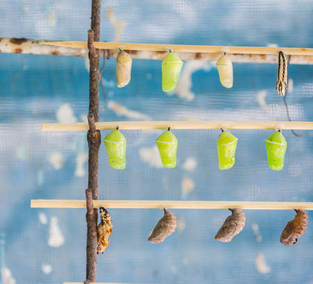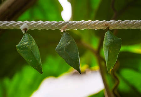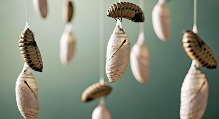 Butterfly chrysalises cocoons hanging, representing transformation and new life