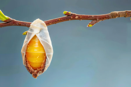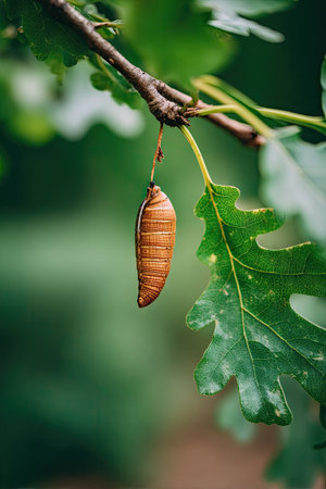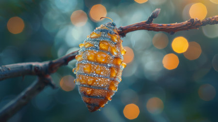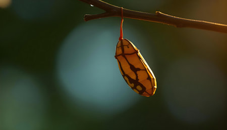 Butterfly cocoons hanging gracefully on a branch in a botanical garden, symbolizing transformation and growth while showing the intricate beauty of nature's life cycle