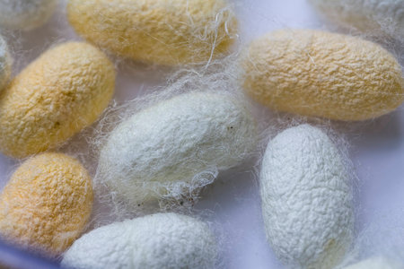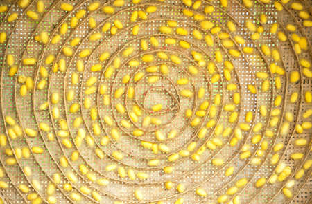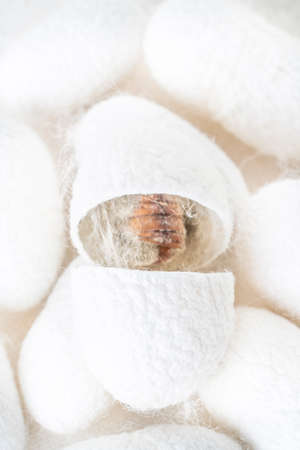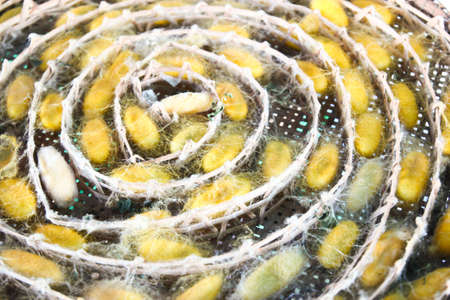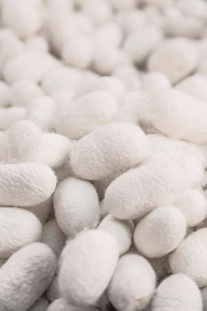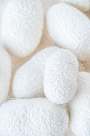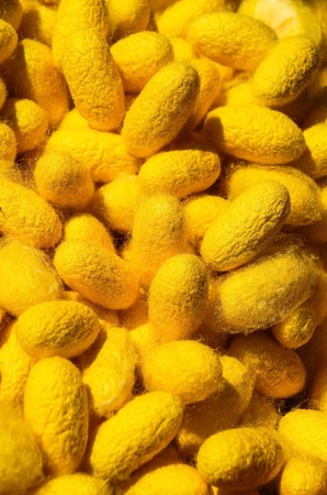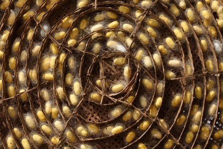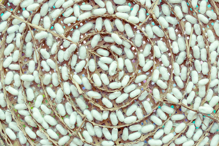 background with silk cocoons the commercially bred caterpillar of silkworm moth, which spins a silk cocoon that is processed to yield silk fiber. Silk cocoon commercially bred caterpillar of silkworm