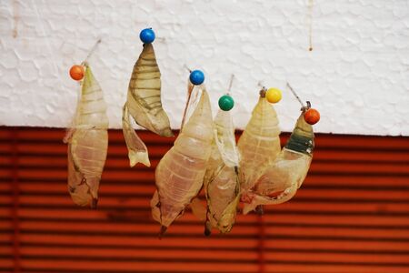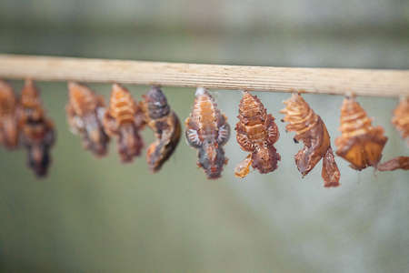 Pupae of exotic butterflies weigh on a branch Artificial breeding of exotic butterflies.