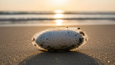 A close-up shot captures a jellyfish resting on a sandy beach. The image features soft, golden light from the setting sun, illuminating the ocean waves in the distance. The composition highlights textures and tones, suggesting a natural environment. Suitable for editorial or commercial applications, this image evokes a sense of peace.