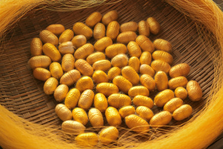 A close-up, overhead view showcases numerous golden silkworm cocoons arranged in a textured woven basket. Strands of bright yellow silk thread are visible, framing the collection.