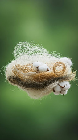 An abstract composition featuring cotton bolls, natural fibers, and twine arranged in a nest-like structure against a soft green blurred background.