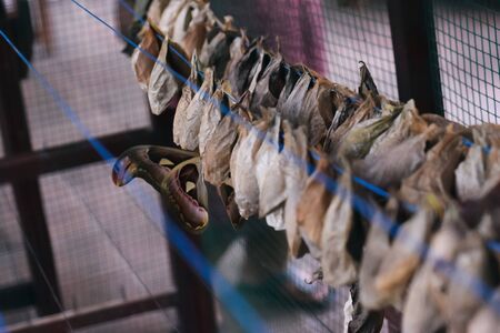 Butterfly birth at the butterfly garden in Bali , Indonesia. Big cocoons are hanging on wires in a nursery.