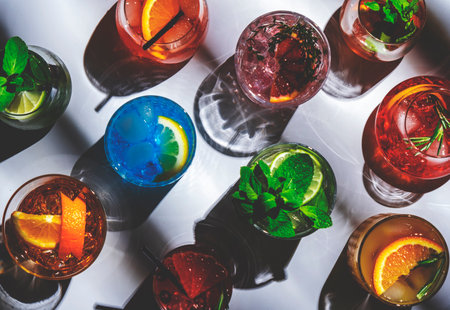 Variety of alcoholic cocktails on bar counter. Colorful drinks.