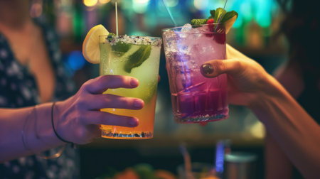 Close up of people cheering cocktails in a bar. Cheerful friends clinking glasses. Alcohol and toasting, party and celebration theme. Generative AI illustration