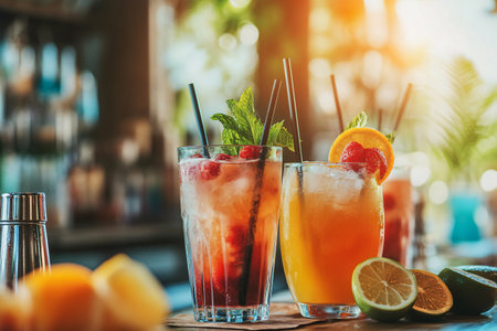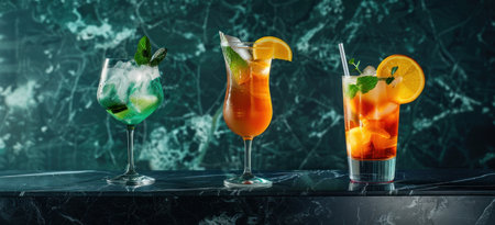 Discover an exquisite display of colorful cocktails featuring citrus garnishes and fresh mint. Perfect for summer parties or nightlife settings, these drinks evoke a vibrant atmosphere.