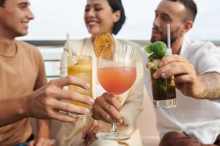 Group of young people drinking sweet delicious fruit cocktails in rooftop restaurant, focus on foreground