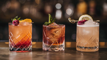 Close-up shot of three diverse cocktails, showcasing the intricate details of the drinks, including garnishes, textures, and rich colors.