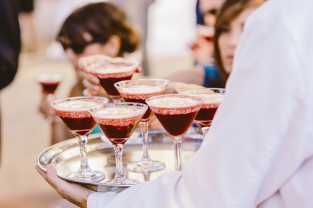 Bartender in front of beautiful row of different colored alcohol cocktails on a party in a nightclub bar, martini, vodka, and others on decorated catering banquet table on open air event