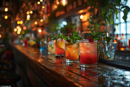 Colorful cocktails served at a vibrant bar in the evening with garnishes and a lively atmosphere