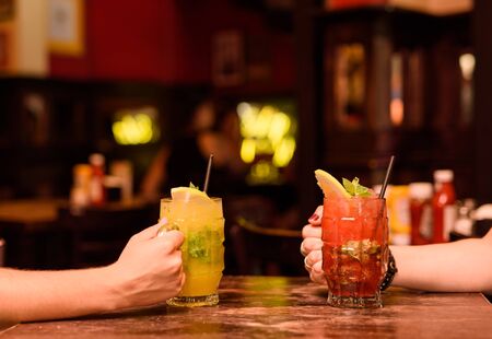 Close up of two people cheering cocktails in bar or disco club drinks and cocktails concept