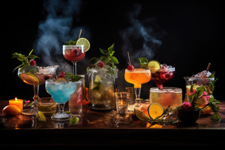 Tasty and colorful drinks based on various alcohols, syrups and liqueurs, unique effect of the bartender's work, party night