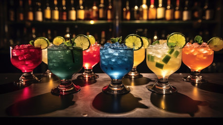 Line of many colorful alcoholic cocktails on a bar in a nightclub on dark background. Generative AI