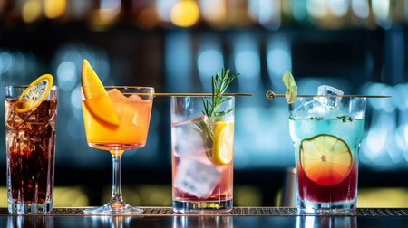 Close-up of group of stylish coloured cocktails with ice and lemon on the bar counter. Generative AI.