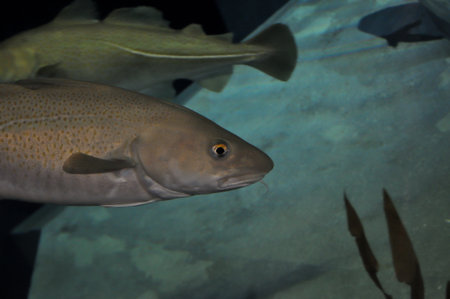 Cod fish in the aquarium. Close-up view of the head.
