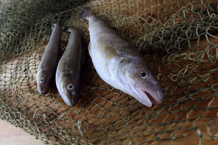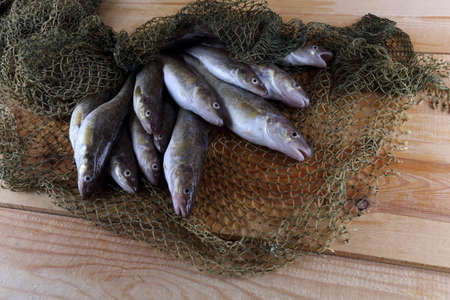 Fresh fish, raw code fillet. Lies on a wooden board in the kitchen