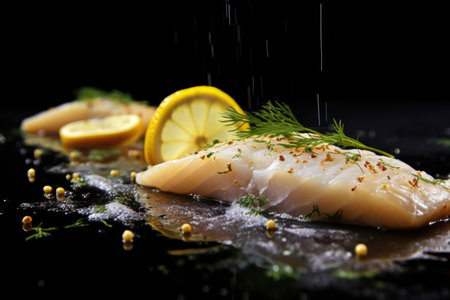 detailed shot: lemon juice droplets falling on baked cod, created with generative ai