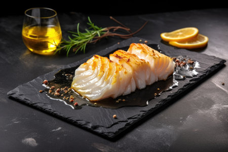 baked cod on slate with lemon wedges, minimalist, created with generative ai