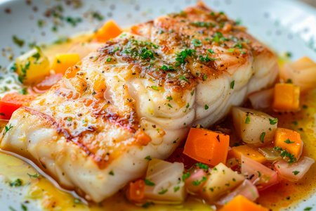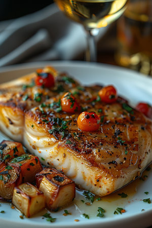 A beautifully cooked cod fillet served with a rich beurre blanc sauce, garnished with herbs, captures the essence of fine dining in a warm atmosphere. Generative AI