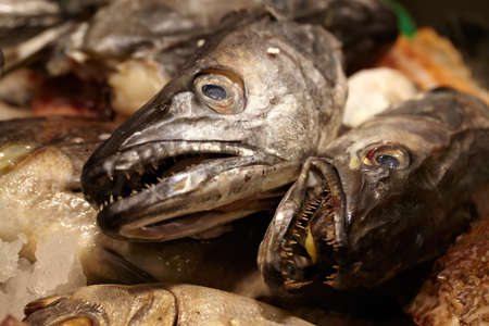 Fish heads with sharp teeth. Fresh food at the market.