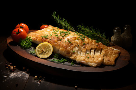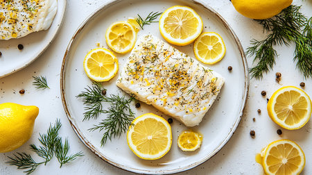 Delicious cod fillet with lemon and herbs on a plate, ready to be eaten
