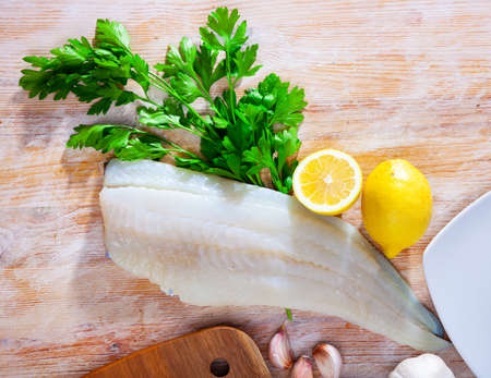 Fresh cod fillet with parsley on wooden board