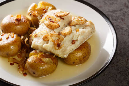 Portuguese Bacalhau a Lagareiro salted cod baked in oil with potatoes close-up in a plate on the table. horizontal