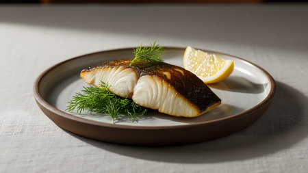 A perfectly pan-seared white fish fillet with crispy golden skin, served on a ceramic plate. Garnished with fresh dill and a lemon wedge, the dish represents a healthy and gourmet seafood meal.