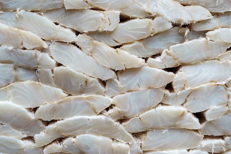 Photo of stand full of salty codfish fillet, side view