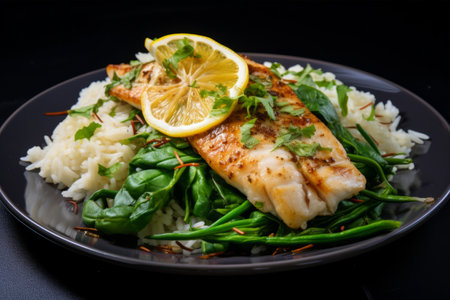 Deliciously Baked White Fish with Wilted Spinach, Green Beans, and Rice Delight -- AR 3:2