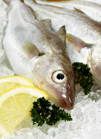 Whiting, merlangius merlangus, Fresh Fishes with Parsley and Lemon on Ice