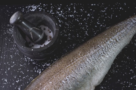 Sciaena umbra on black wooden background at the kitchen