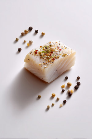 Fresh fish fillet garnished with various spices, highlighting culinary artistry. Clean white background enhances focus on ingredients.