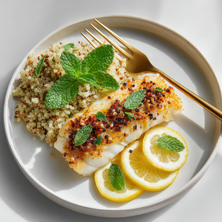Delicious grilled fish fillet, topped with mint and served with quinoa and lemon slices, creating a colorful and nutritious dining experience
