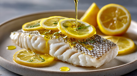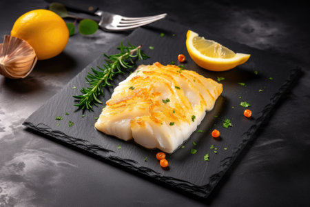 baked cod on slate with lemon wedges, minimalist, created with generative ai