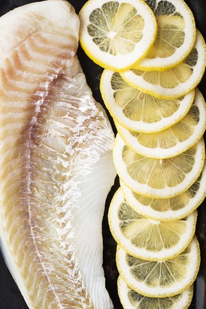 White fish fillet with lemon and herbs. Selective focus.