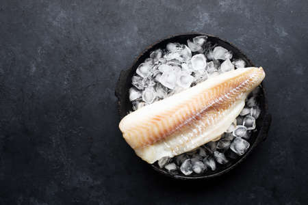 Fillet of white sea cold-water fish cod in ice cubes on a dark background. Top view