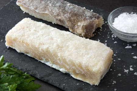 Salted dried cod on black stone. Top view. Typical Easter food