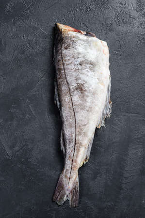 Raw haddock fish without a head. Black background. Top view.