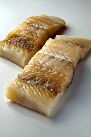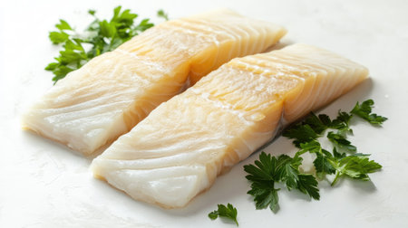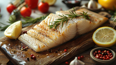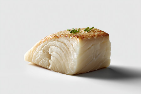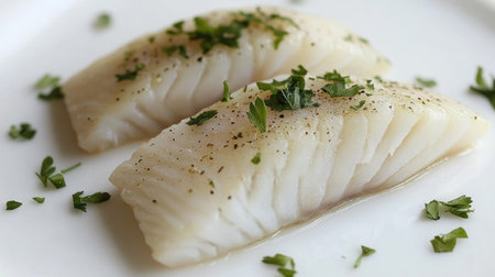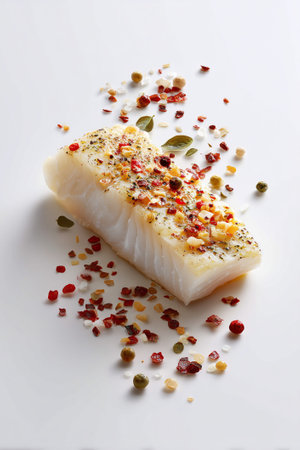 Fresh cod fillet garnished with spices on clean white surface. Emphasis on culinary art, delicious seafood preparation, and appetizing presentation.