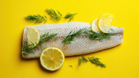 A white fish fillet is placed on a vibrant yellow surface, garnished with slices of lemon and sprigs of fresh dill. This setup highlights the freshness of the ingredients.