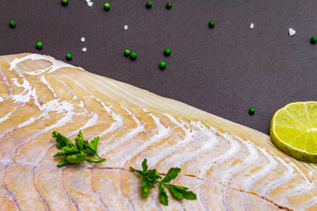 Fresh pollock fillet with lime, green pepper, salt and parsley. Concept of healthy seafood. Organic fish on a black stone background, copy space, close up