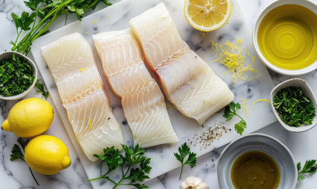 Fresh cod fillets with herbs and lemon premium raw seafood for cooking and culinary creations
